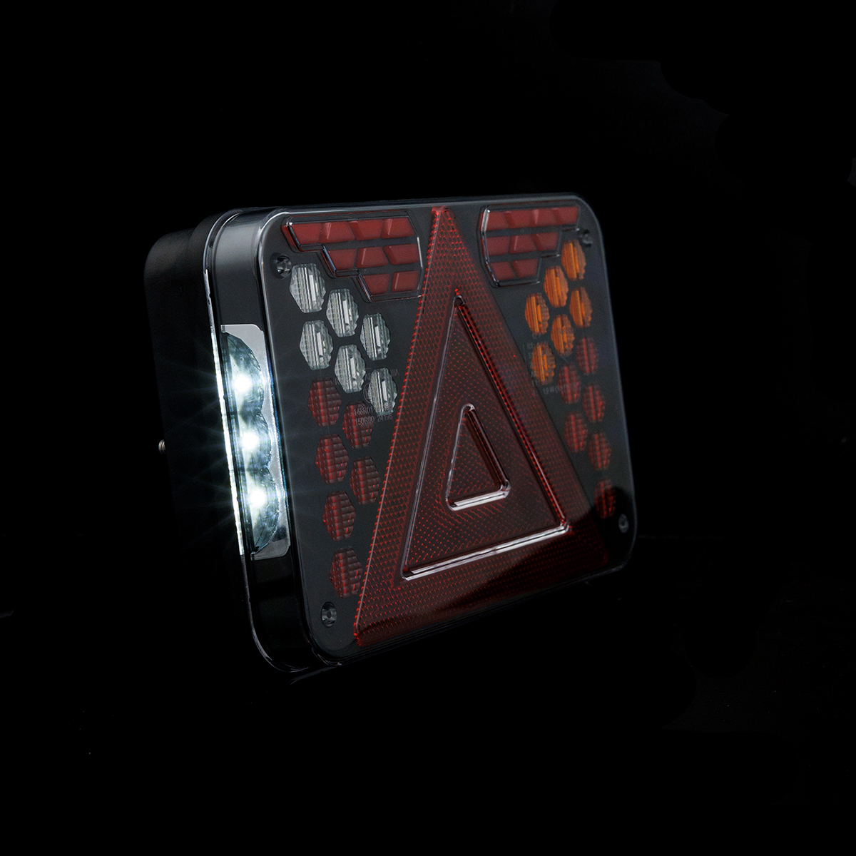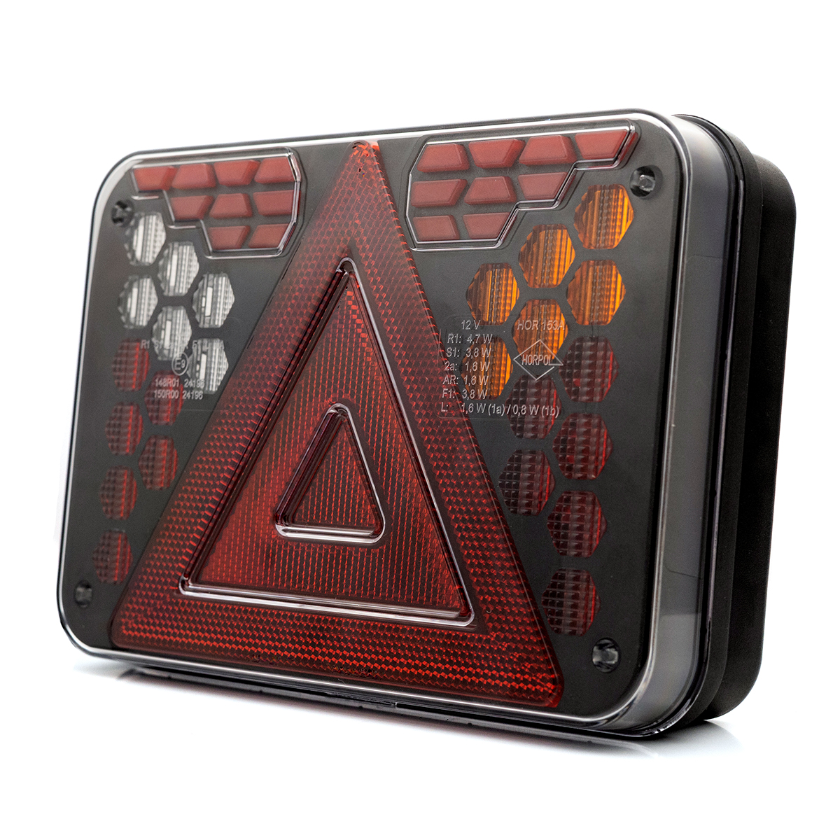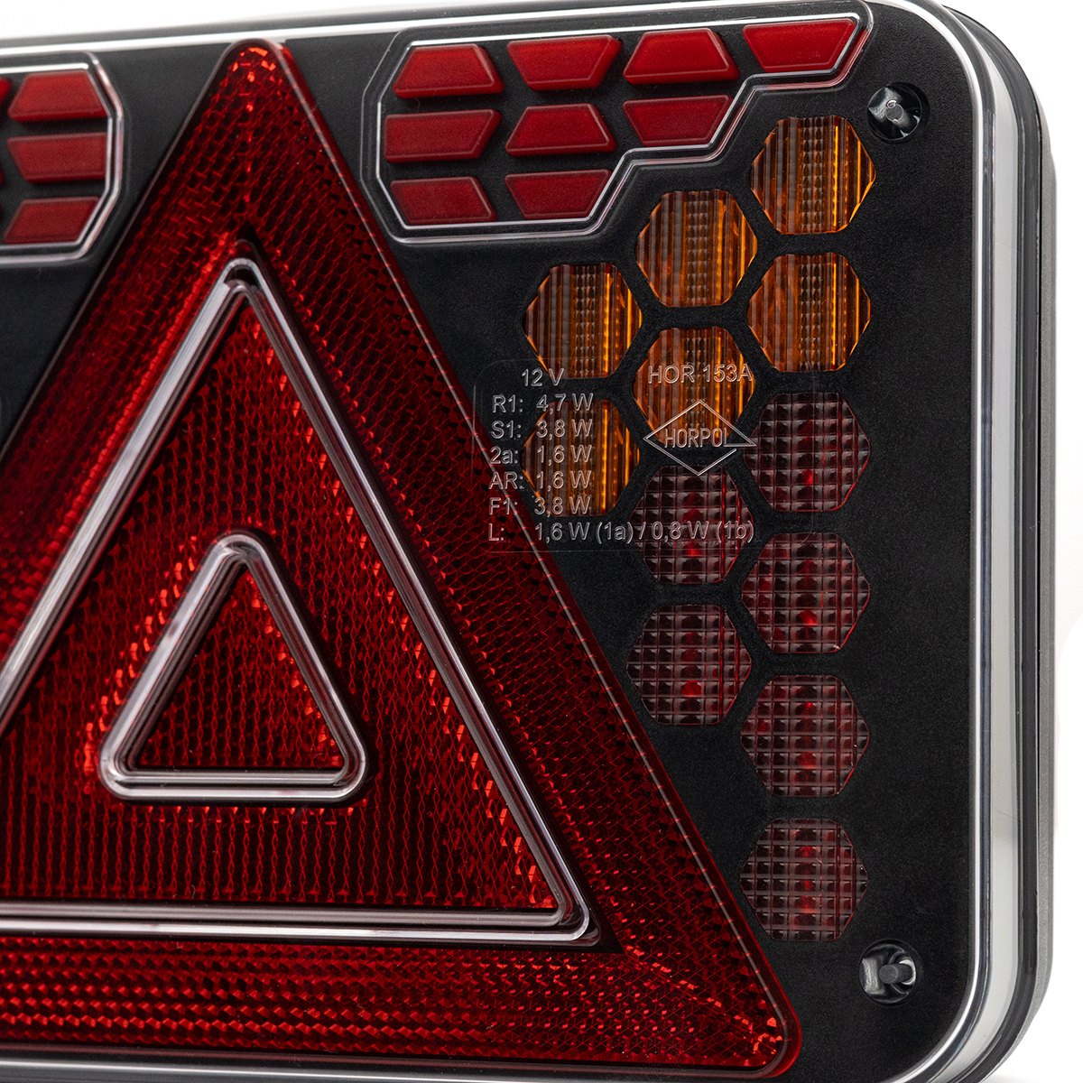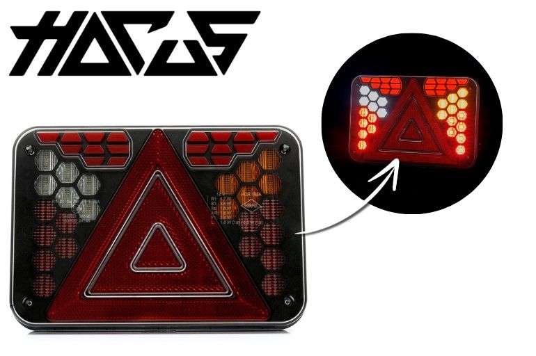 HORUS LZD 3216 est un feu arrière combiné moderne destiné aux remorques automobiles, agricoles et spécialisées, conçu dans des dimensions compactes et dans un souci de durabilité maximale. Le design de ce feu repose sur des modules géométriques individuels, formés avec précision, qui créent une composition lumineuse cohérente et spectaculaire sur le fond noir profond du boîtier. L’ensemble est protégé par un diffuseur en polycarbonate transparent et durable, qui résiste aux dommages mécaniques et au fonctionnement dans des environnements difficiles.