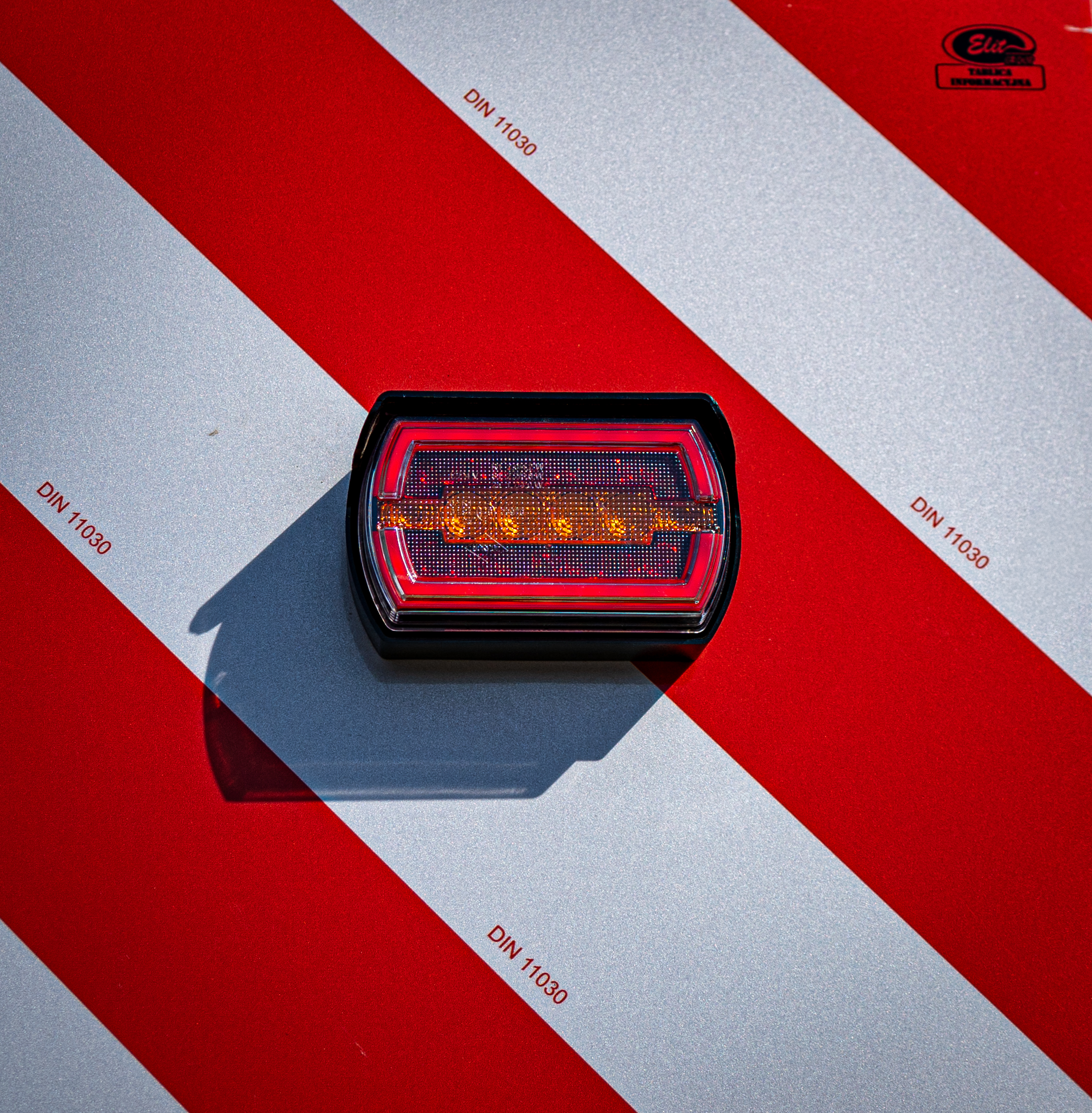 – deux panneaux carrés pour charges hors gabarit (gauche et droit), en configuration rouge et blanche en biais, revêtus d’un film réfléchissant des deux côtés (dimensions de chaque panneau : 423 × 423 mm);